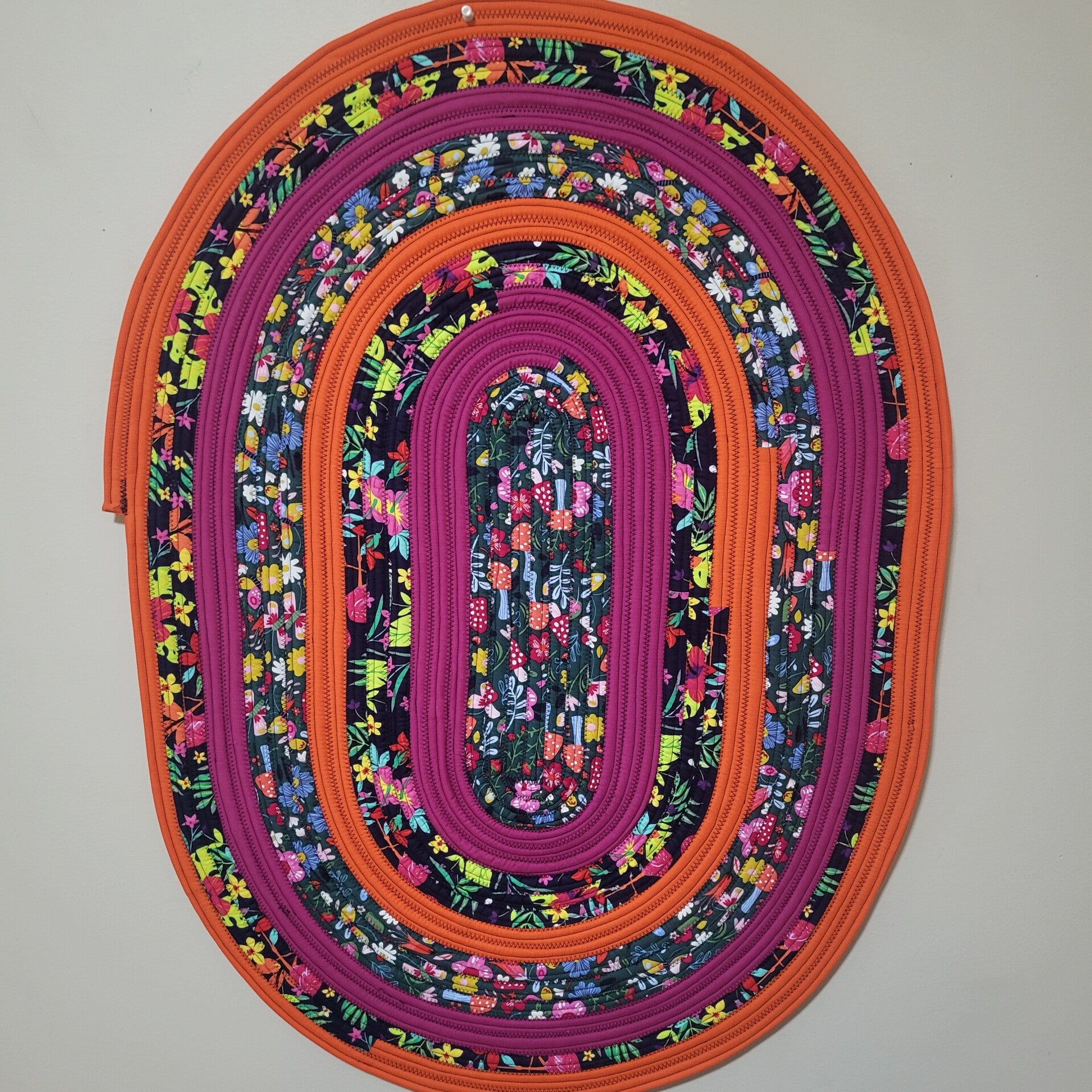 26in by 36in handmade jellyroll rug. Machine washable. Lay flat to dry.