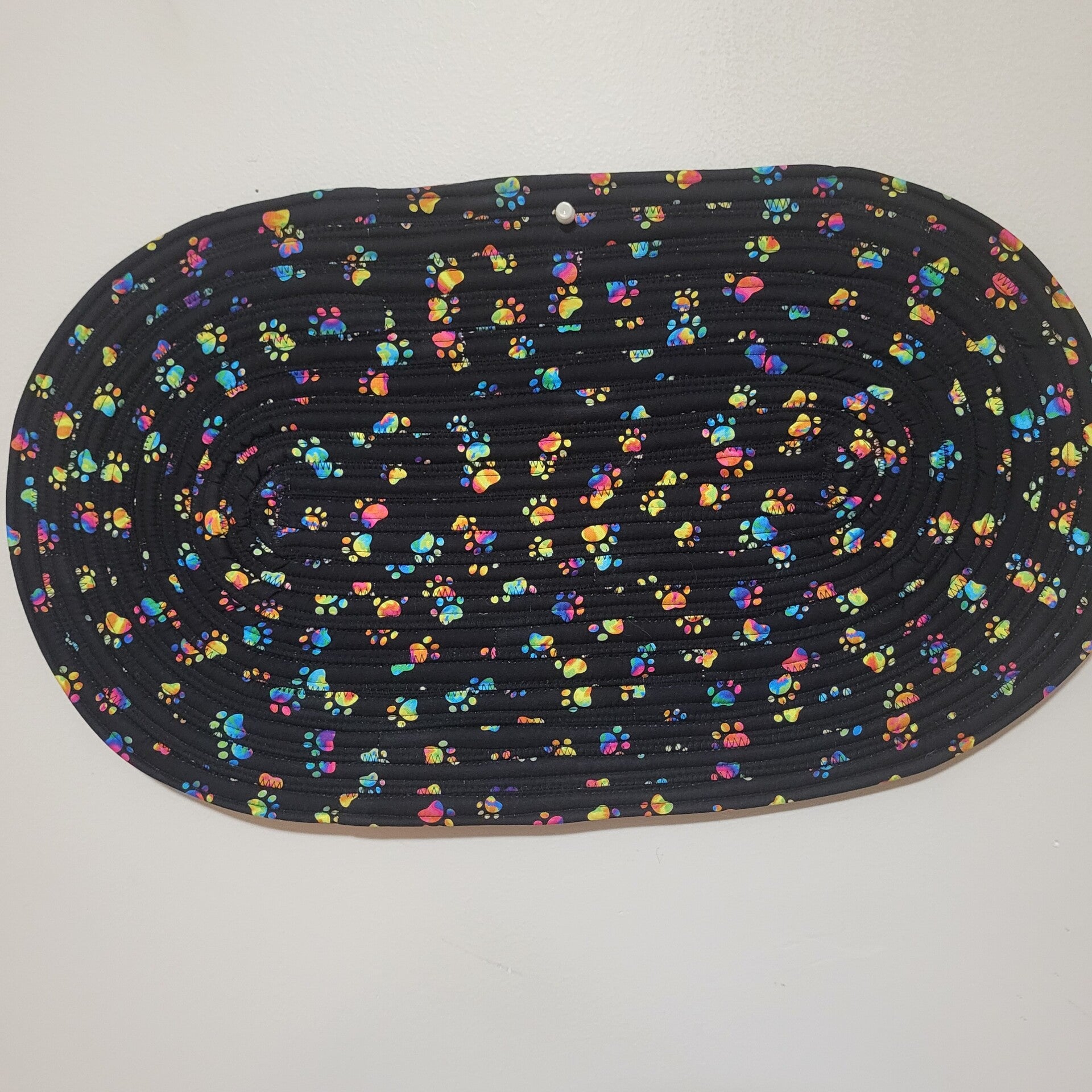 13in by 21in handmade jellyroll dog bowl mat. Machine washable. Lay flat to dry.
